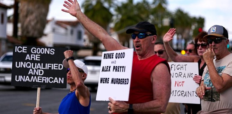 People rally against immigration enforcement and the recent killing of Minnesota protester Alex Pretti in downtown Palm Springs, Calif., on Monday, Jan. 26, 2026.