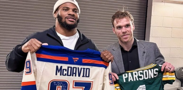 After the game, the Oilers’ official X/Twitter account shared a photo of Connor McDavid and Micah Parsons completing a jersey swap. Each player wrote a special message to the other before they posed for the image: