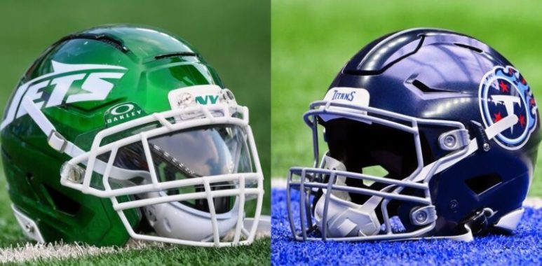 Titans and Jets helmets (Photos via Imagn Images)
